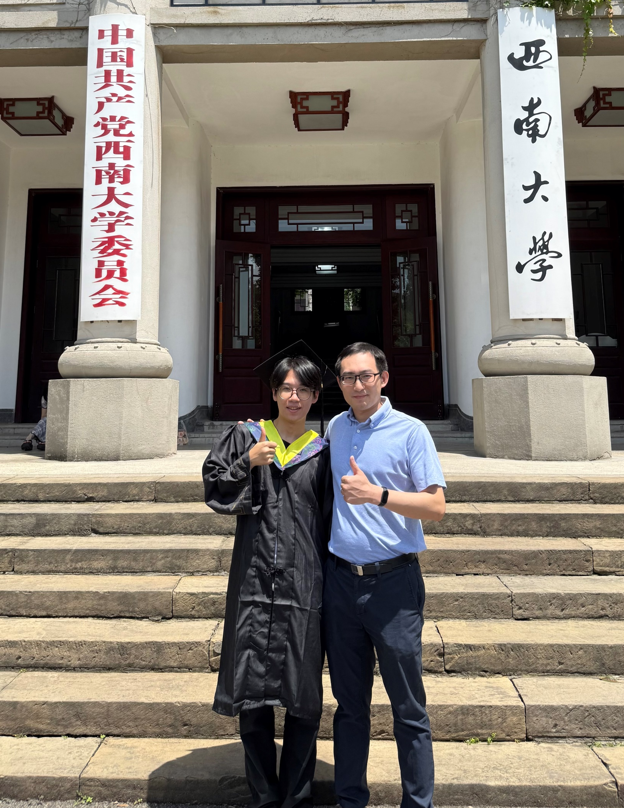 A memorable graduation photo taken at Southwest University in 2025 with my undergraduate supervisor, who guided me throughout my four years of study.