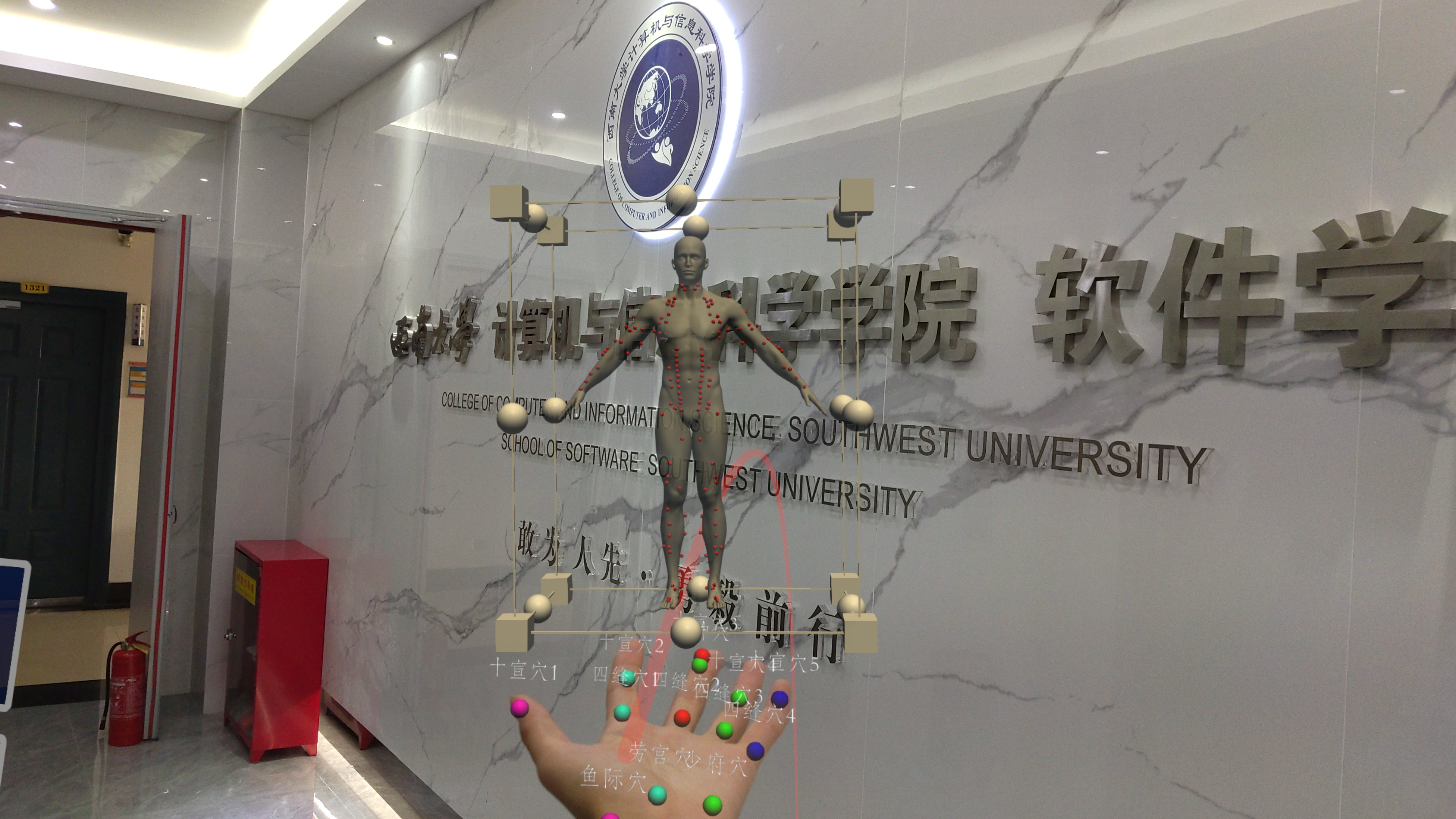 Demonstrates hand acupoint detection and teaching based on a standard acupoint model.